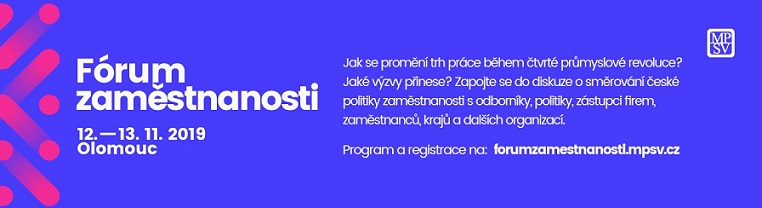 Ministerstvo práce a sociálních věcí si Vás dovoluje pozvat na mezinárodní Fórum zaměstnanosti s názvem Jak se promění trh práce během čtvrté průmyslové revoluce? Jaké výzvy to přinese? s podtitulem “Trendy a výzvy trhu práce 4.0”, které se koná ve dnech 12. – 13. listopadu 2019 v Olomouci (Clarion Congress Hotel).